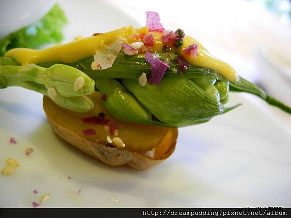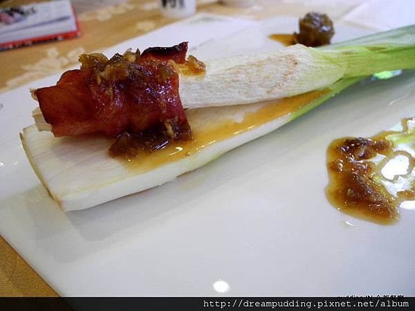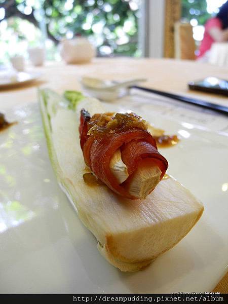 金都將筊白筍烤過之後再捲上培根,一旁附了梅肉及梅醬,話說這筊白筍烤得真是厲害,保有清爽脆甜且還有微微汁液,好吃啊。