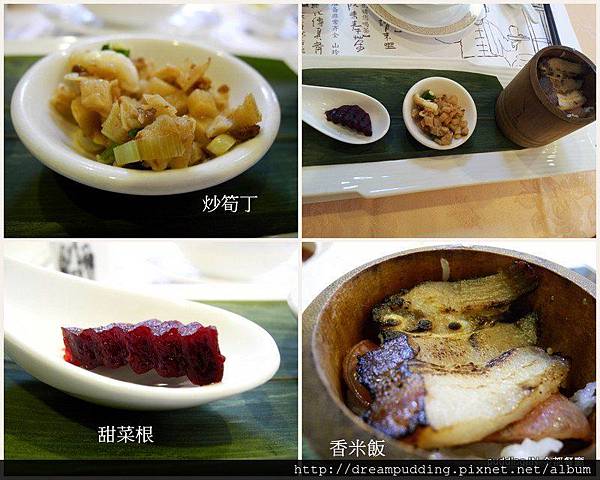 竹香香米飯,香米飯就是一年收成一次的旱稻烹調而成,吃起來緊密且黏帶有點Q及嚼勁,上頭配的是紹興鹹豬肉及香腸,但有點小乾;一旁附的香炒筍丁十分好吃,清脆的很有味道;甜菜根有紹興酒的香氣跟梅子的甘甜,甜脆。