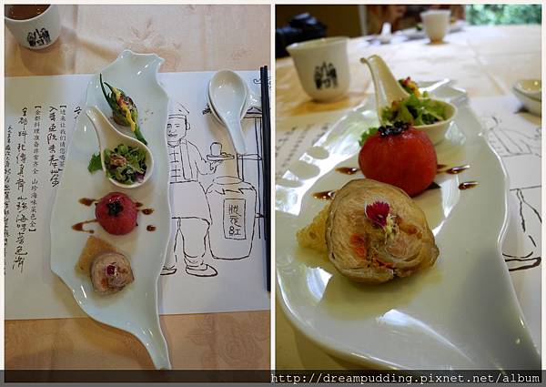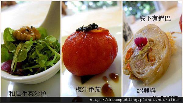 大埔城田園組曲,有4種小品,服務人員說由於我們位於南投中部,所以先從擺放在中間的梅汁番茄開始吃起。