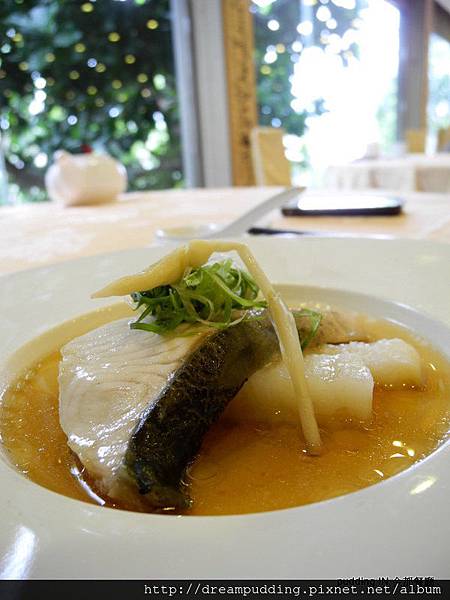 鱘龍魚給了很大一塊,魚肉緊密帶柔,配著青蔥沾汁液吃,風味更勝,山藥也是黏滑可口。