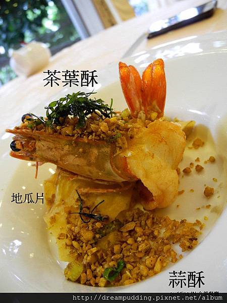 茶酥海大蝦,蝦子已經細心的剖了背,此外也會隨餐附上濕紙巾讓顧客擦拭剝殼的油膩,蝦肉緊實Q彈,配上炸的香酥的蒜酥及帶有茶香的茶酥一塊吃,味道很協奏曲,尤其是那茶酥,好解膩啊 ! 底下鋪的地瓜片也是喀滋的好吃啊。