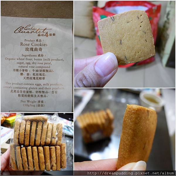 包裝是防油的厚牛皮紙袋,我買了玫瑰口味的;這一袋港幣62,換算台幣約200左右。曲奇四重奏的曲奇餅從視覺上即可看出,他較不油(跟小熊曲奇餅相較),但也就比較沒那麼鬆軟香;近聞是真的有玫瑰味的;切片也算厚,味道濃厚中帶淡雅,不會膩口。