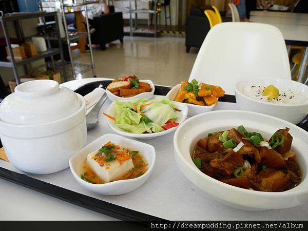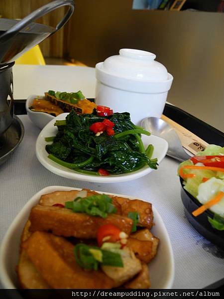 小甜的五香東坡飯,除了主食外,還附了4樣小菜,跟放了一塊地瓜的白飯及一碗筍湯。我喜歡心家坡的原因是它的小菜不是涼拌的,很多店家所販售的簡餐所附的配菜3樣大多有兩樣會是涼拌,可是心家坡的小菜很用心,這次有豆干、高麗菜、南瓜跟豆腐。
