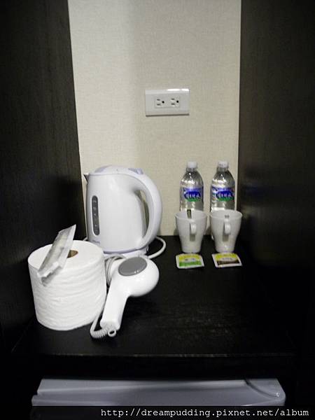 吹風機、電熱水瓶還有備用的衛生紙捲都放在小冰箱的上方。