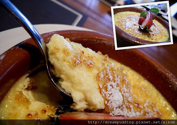 我最愛的就是這道香草烤布蕾,採用新鮮香草製作的烤布蕾,為其穿上金黃盔甲,等待饕客將其心防打開而一嚐綿密。他已經打敗我心目中第一名的罌粟阿豪師傅製作的烤布蕾了,還好我學長先離席,沒辦法跟我搶,我一個人吃完一整個。