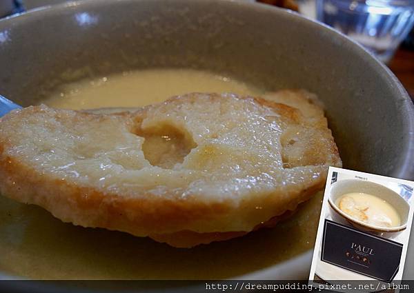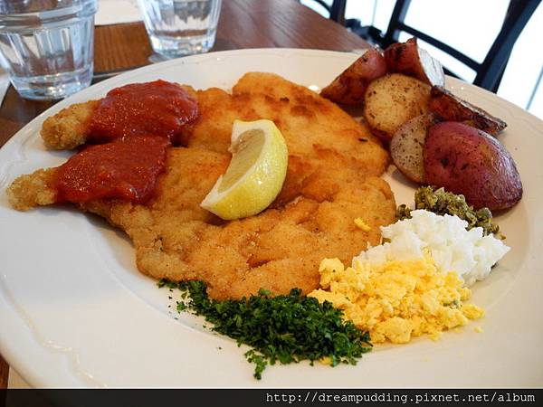 食用的時候搭配4種佐料一起吃,話說這雞排口感很細緻,一點都不油,很難相信雞排用煎的口感能如此清爽,口感細緻到像魚排,我都驚艷了。一問之下,原來這雞排裹了PAUL自家麵包製作的麵包粉,再加上獨門烹調手法,因此口感才會如此細緻,難怪我們在點餐時,服務人員很推薦這道。