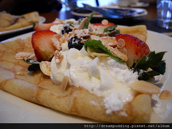 可麗餅皮軟Q的口感,搭著鮮奶油跟水果一起吃,口感很豐富。