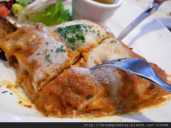 肉醬採用牛豬肉混合,內餡還加了帕瑪森乳酪跟蘑菇,吃起來口感不會膩,肉醬感不會太重也不會過鹹,連我這個不吃肉醬的人都覺得好吃,吃了很大一大塊。