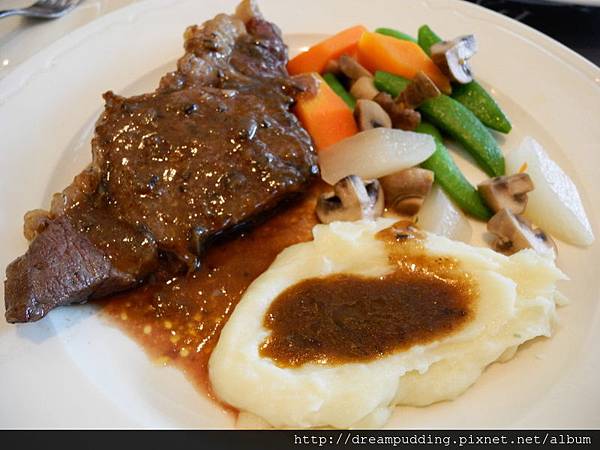 聖傑曼牛排佐奶油馬鈴薯泥。