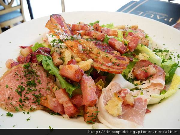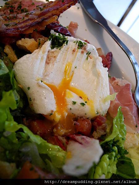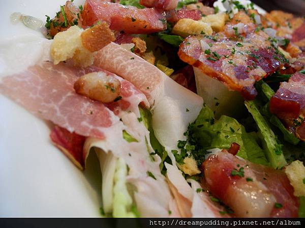 新菜之一的經典里昂燻肉佐水波蛋沙拉採用傳統里昂式煙燻手法料理,裏頭加入了培根、義式沙拉米及帕馬火腿三種肉品,這個肉在放都不手軟的,超豪邁。