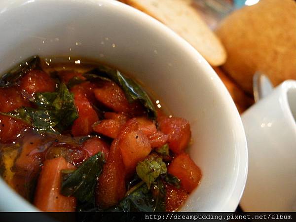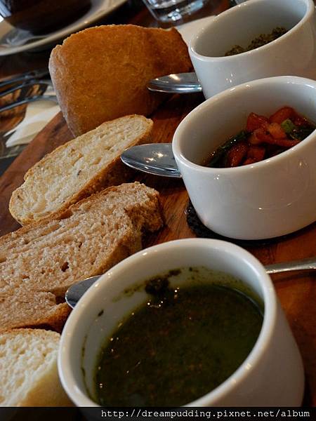 招牌的法國麵包仍保留其樸實內斂的口感,在其佐料上填入了夏天的熱情,有微酸清潤的酸豆橄欖醬、清新奔放的番茄莎莎醬及味道濃厚的松子羅勒,隨顧客喜好幫那樸實的法國麵包換上不同的外衣,使其風情萬種。很貼心的一點是,在每盅佐料下都鋪上防滑墊。