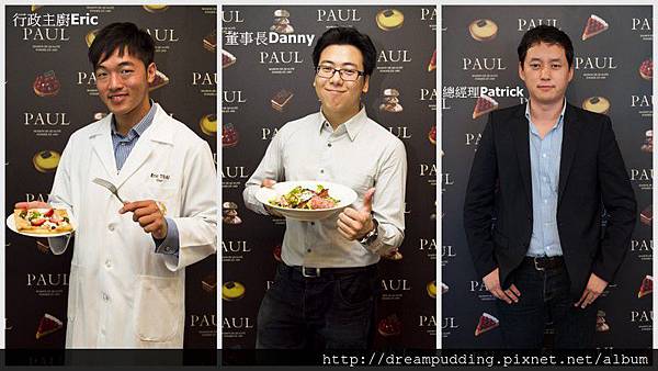 話說PAUL的主管級人物都年輕有為,由左至右為行政主廚Eric、董事長Danny、總經理Patrick,言行舉止談吐穿著有型到像GQ雜誌的MODEL是怎樣,三個感覺都是優質好男人啊。連我現在的同事Luna(之前曾在PAUL任職)聽到我這天來PAUL參加新菜餐敘,一直問說Patrick是不是還是一樣帥,雖然她已經轉換跑道,但還是大力讚賞前上司的帥氣,原來在PAUL上班這麼幸福,每天都能看台灣版GQ的MODEL。
