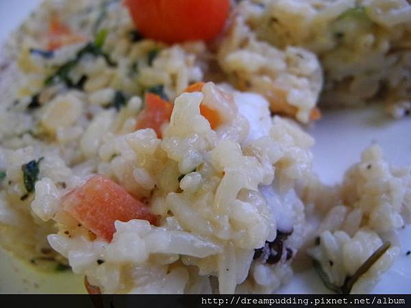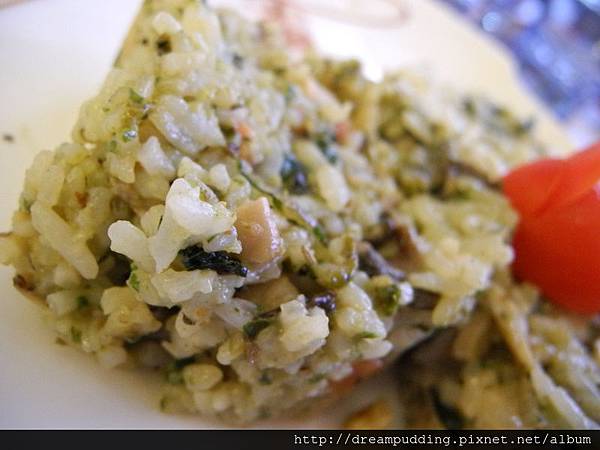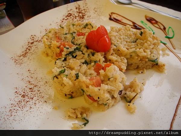 雞肉捲很大一捲,外層還捲入了培根,部分有點小硬,但不會到乾,算有嚼勁,醬汁的味道非常濃郁,味道很重,是紅酒放太多嗎?也不像香料味,比較接近肉的味道,我也不知該怎麼形容,吃起來味道有點自然鹹,但聞起來卻非常濃郁,布丁媽只吃了一口就不敢吃了,所以後來我的燉飯跟布丁媽換排餐。