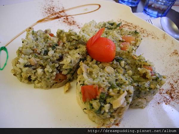 青醬蒜泥蝸牛燉飯,蝸牛肉都被切成碎片入在燉飯裡,味道挺濃郁的,可惜的是米飯還是偏軟,我應該要事先問主廚燉飯的軟硬度,再跟他說我想吃帶點米芯的。