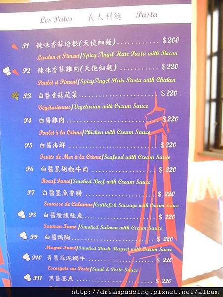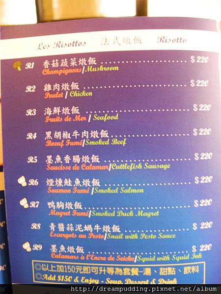 餐點有義大利麵、燉飯跟排餐,話說在第三張中下方看到燉兔肉跟炒青蛙腿,覺得好特別,但我點了一定沒人要跟我一起吃,所以我只好點蝸牛燉飯。