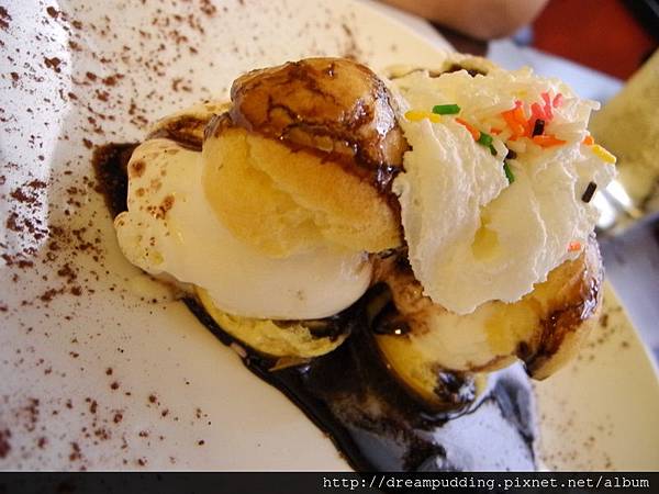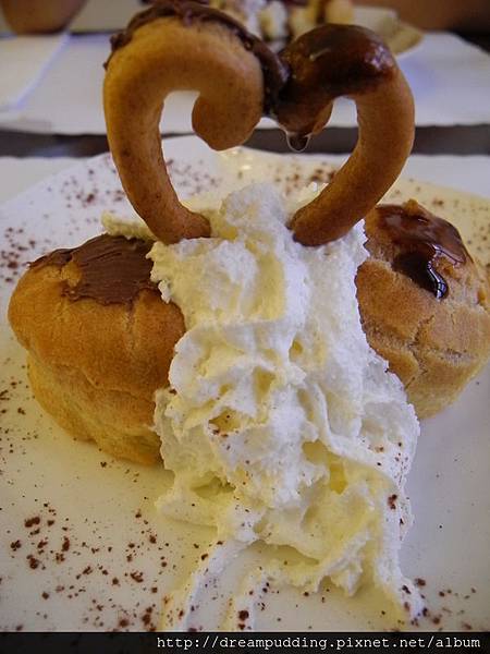冰淇淋泡芙,泡芙殼有點軟掉,有巧克力醬有香草冰淇淋,吃起來還挺幸福的。