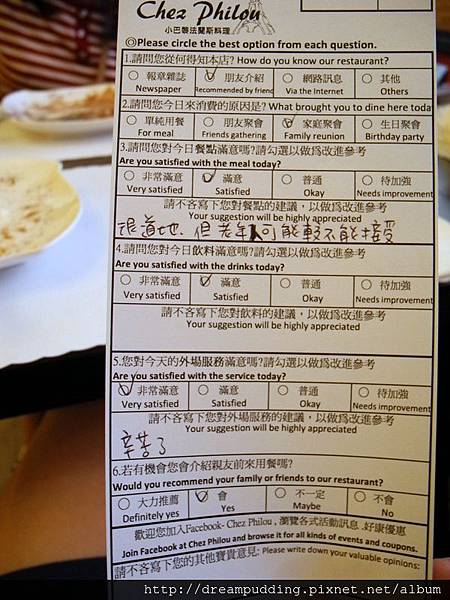 送餐完畢時,主廚會送上一張意見表請你填寫。