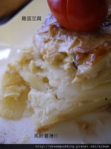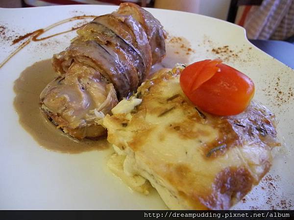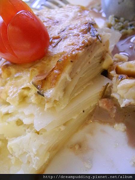 不過話說這雞肉捲一旁的配菜就厲害了,本以為是單純的焗烤千層馬鈴薯,沒想到最上層鋪了雞蛋豆腐,跟馬鈴薯薄片MIX吃,吃起來有滑嫩跟Q還有扎實感,很讚。