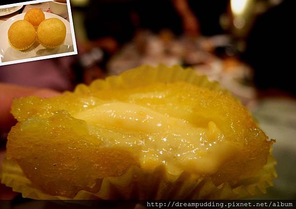 黃金流沙球,我最愛的一道茶點,現榨的熱呼呼,表皮微酥,咬下去輕盈,但入口是熱燙的內餡跟微Q的口感,一不小心,會留得滿手都是。