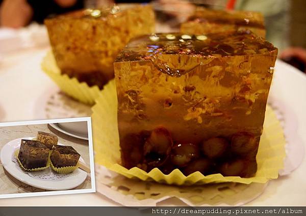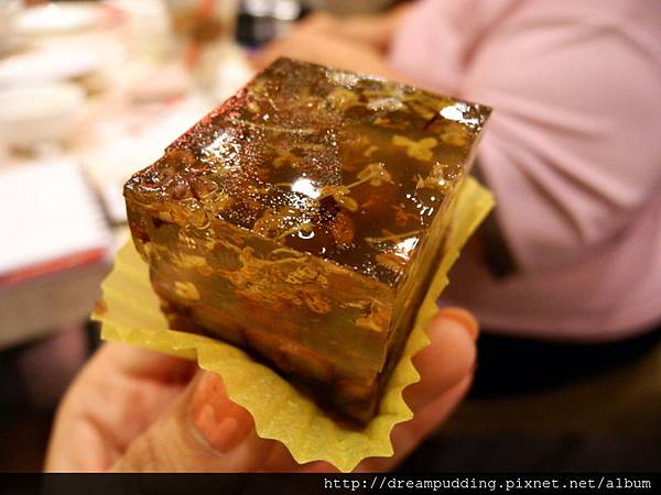 桂花紅豆糕,這超得我心的,吃起來有淡淡的花香,晶瑩剔透的美感,底下的紅豆散發微微的甜,吃起來好清爽高雅啊。