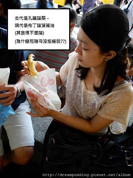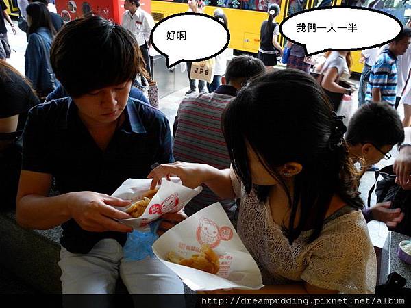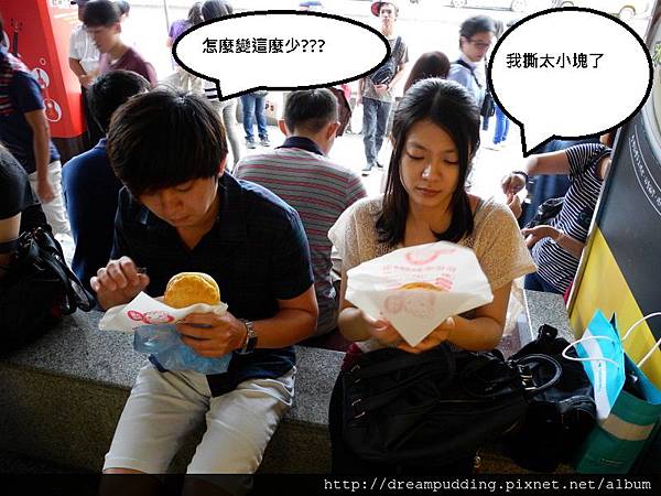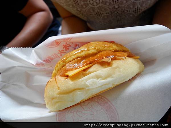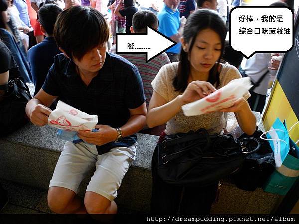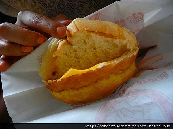 點兩種不同口味就是能交換一起吃,所以我撕了我的那一半菠蘿油,問拖鞋哥要不要一人一半。(但其實我內心一直期待他能拒絕我,然後主動地給我他那一半菠蘿油,結果一直到我的一半菠蘿油放到他的袋中了,他還是沒開口拒絕我)。