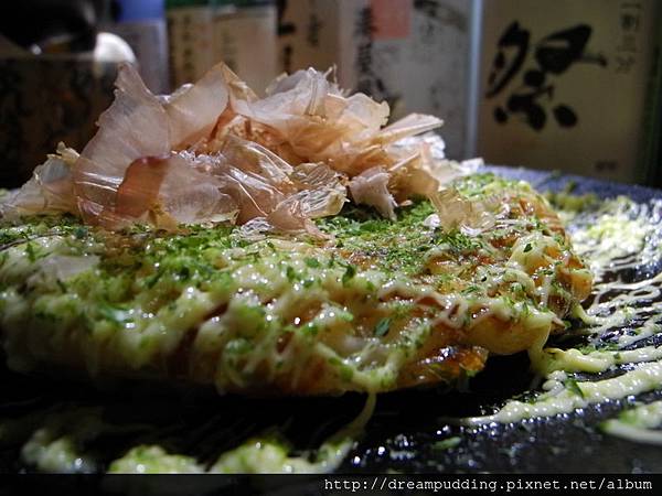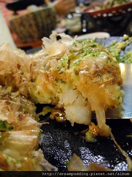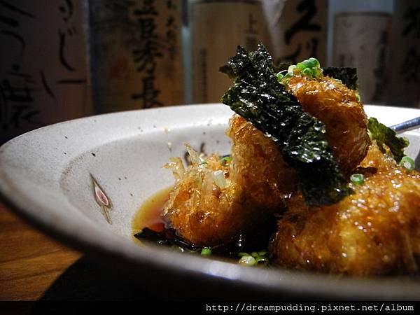 揚出豆腐,這特別的是,他是裹著柴魚花下去炸的,所以外皮吃起來不會油膩也不脆,但是酥,裡面是嫩嫩的雞蛋豆腐。
