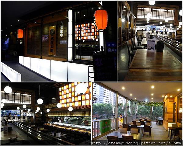 一樓戶外主要是外帶及談天說地區,販賣的餐點很廣,有小吃跟關東煮、燒烤等,也有壽司;一樓室內區則有大魚迴轉壽司,二樓則是大江戶町居酒屋跟宴會廳。