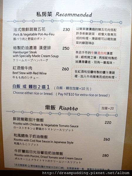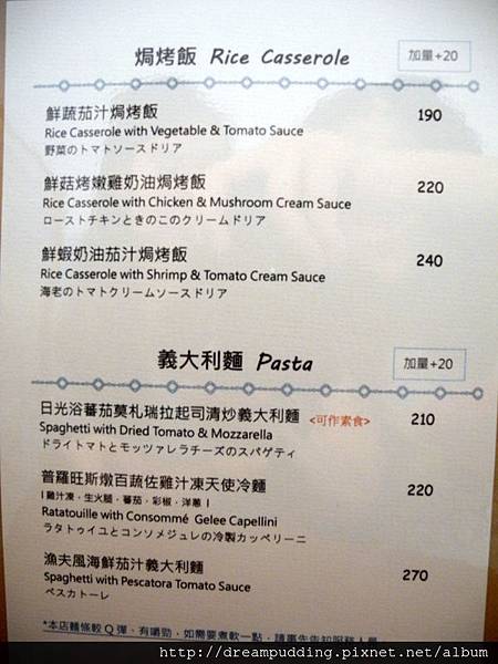 有燉飯跟麵,還可以選擇加量,加量好佛心,只加20元來著。價位也很平價,大多200多,還不收服務費喔。