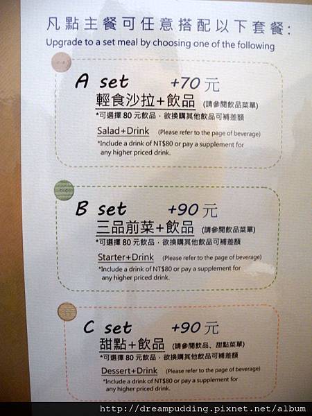 餐點部分有單點跟套餐,如果你單點餐點又要配飲料的話,就直接選A組套餐吧,因為飲料最低從80元起跳,怎麼算都是加套餐划算阿。