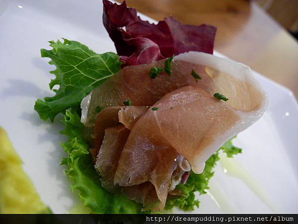 生火腿略帶嚼勁,搭著溫潤的橄欖油一塊吃,很滿足。
