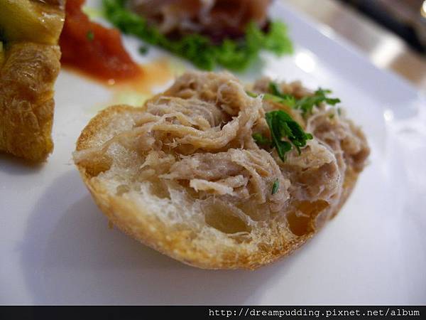 豬肉絲感覺是川燙過再略做調味,吃起來還挺清爽的,搭著略硬的法國麵包切片一塊吃。