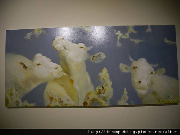 我喜歡這幅牛在玩棉花雲朵的圖,色彩柔柔的,看起來很舒服,有點兒五月花廣告的感覺。
