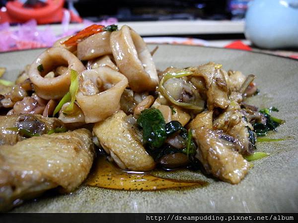 三杯海陸總匯料很豐富,有透抽中卷跟很多雞翅,因為文智夫婦一家都愛辣,所以我們就再加入辣椒跟九層塔下去拌炒,聞起來更香。