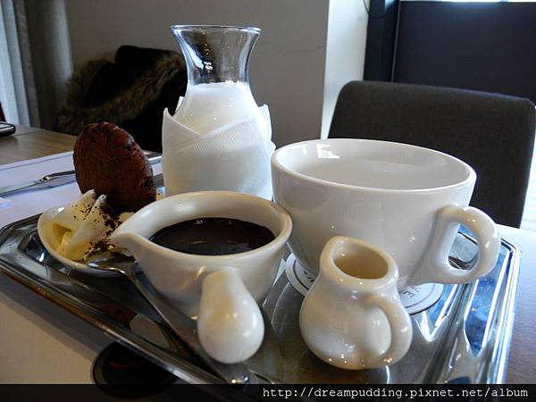 話說那巧克力是不甜的,隔水加熱溶化後還嚐的到細微的巧克力小碎片,跟牛奶混在一起後沒什麼甜味,所以附上了果糖讓顧客自行調整,手工餅乾我沒吃,因為我已經飽到天邊了,愛貓的友人史蒂芬妮說手工餅乾好好吃。