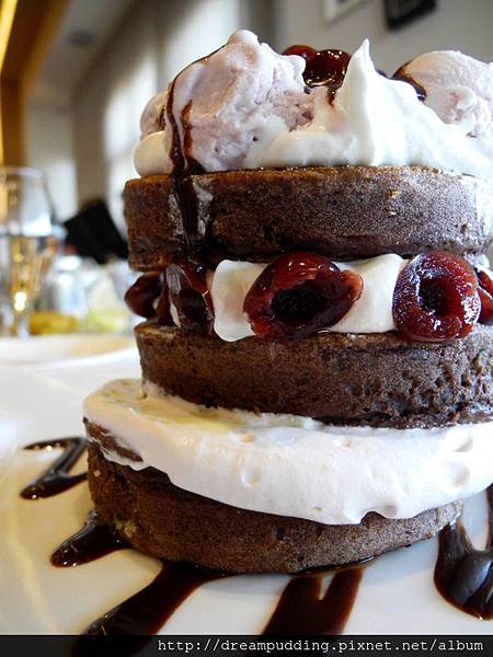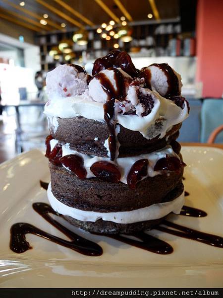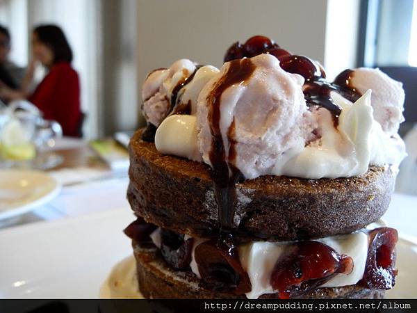 酒釀櫻桃美式鬆餅塔,鬆餅塔是巧克力口味,上面在層層疊疊上酒釀櫻桃跟酒釀櫻桃冰淇淋,口感很巧克力,鬆餅裡面吃得到巧克力豆,口感上的話偏硬,不是鬆軟的那種鬆餅,所以這道就不是我的菜了。>////<。