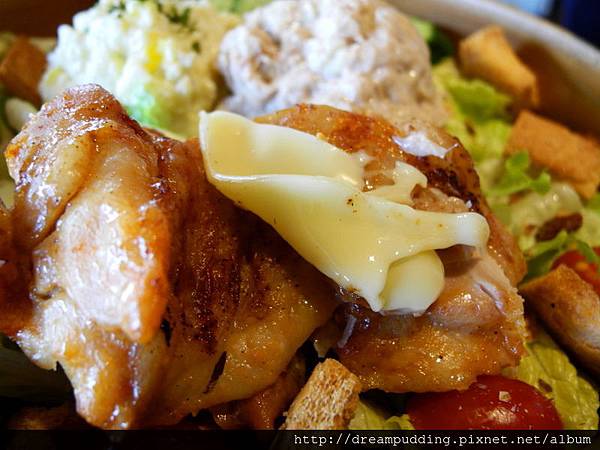 雞肉採用去骨的雞腿排,除了撒上帕馬森起司,還附上一片起司跟著一塊烤增添韻味。口感不是多汁的那種,但也不會乾柴,肉醃的很入味,味道很足。