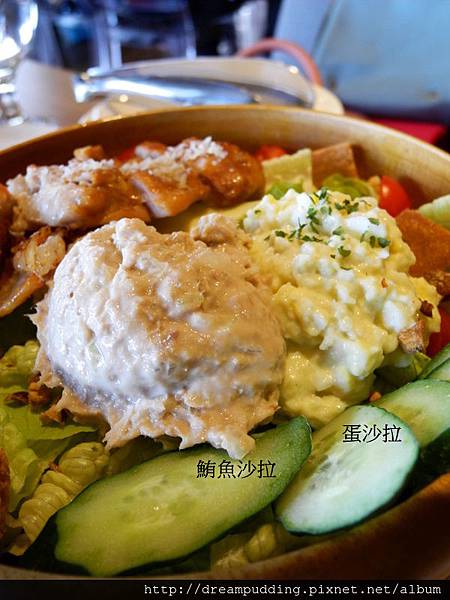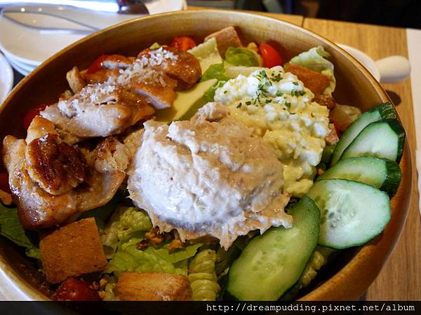 內容物很豐富,有雞肉、起司、鮪魚沙拉跟蛋沙拉,還有蘿蔓跟麵包丁及番茄等。鮪魚沙拉加了洋蔥增添清爽,蛋沙拉有我愛的碎蛋白。