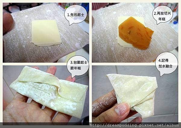 步驟就是把年糕跟起士切的小片再把她包到餛飩皮哩,包好後沾水把她黏緊,餛飩皮老闆是有跟我說也可以用蛋黃啦,但是我很手忙腳亂,所以就匆忙亂包用水把她黏住。