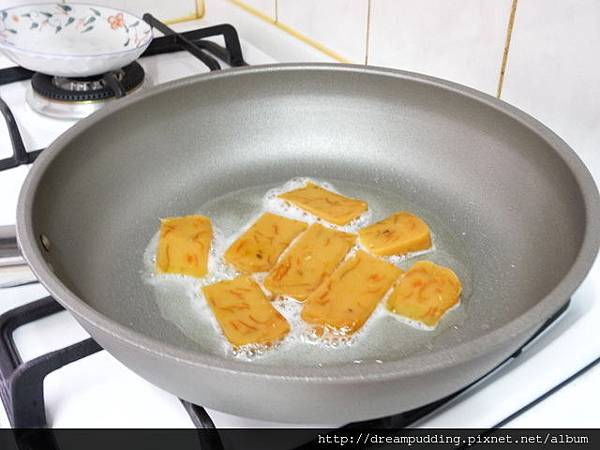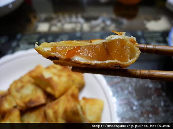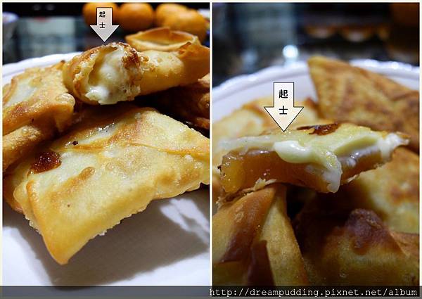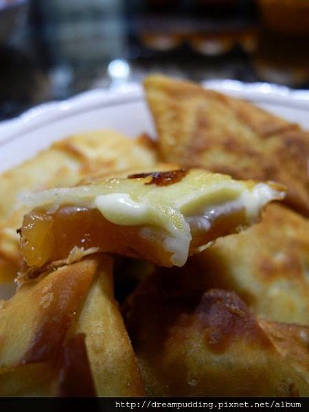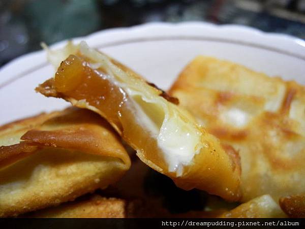 內餡那層黃白的的稠狀體就是起士啦,包餛飩皮的年糕挺好吃的,因為餛飩皮薄脆,年糕Q軟,配上起士的鹹,口感很獨特。不過有人跟我說包鹹菜也不錯,下次再來試驗看看。