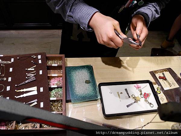 而且這位服務人員服務的好棒,很有耐心且專業,雖然她說什麼我們都聽不懂,但那笑容真的是最好的溝通方式。現場小花選好配件之後,他就馬上開始手工幫我們製作。
