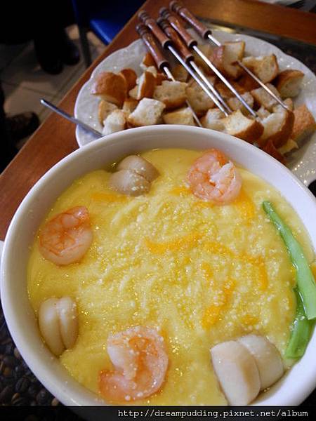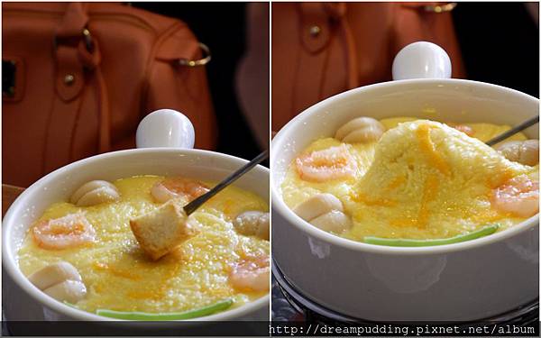 夏多內海鮮起士鍋,裡面有Q彈的干貝及剖背蝦;起士鍋是用多種起士跟馬鈴薯下去熬煮的,配料可以選擇要海鮮、雞肉或是奶素可食的新鮮菇類。