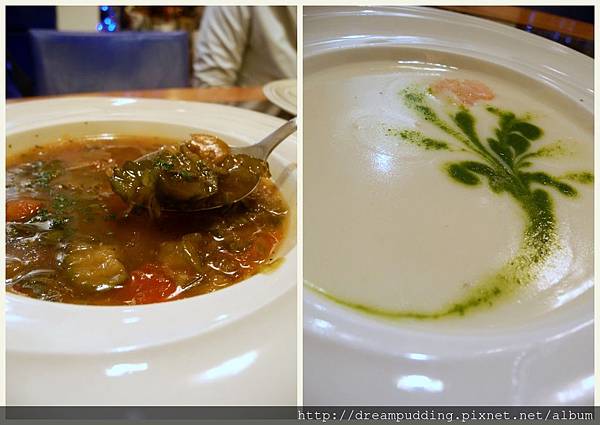 左邊是番茄蔬菜牛尾湯,口感濃郁中有著蔬菜的清爽,好喝。右邊的是威尼斯海鮮濃湯,有點濃。
