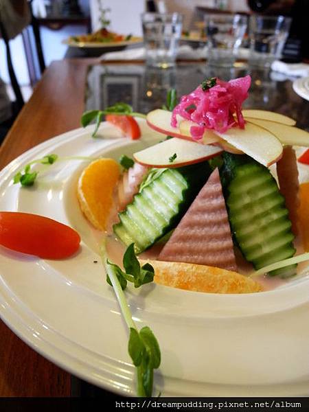 法式優格沙拉,新鮮優格加玫瑰釀,酸甘中帶甜的濃郁,蔬果很多,新鮮營養。