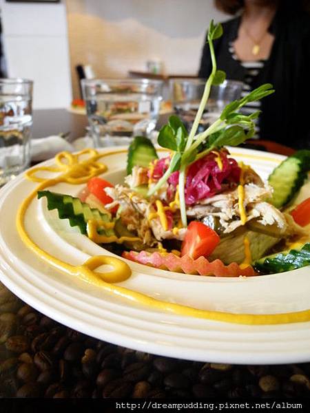 希臘酸黃瓜雞絲沙拉,採用蘋果醋醃製而成的酸黃瓜搭上黃芥末,雞絲跟黃芥末酸甘微辛的很搭阿。