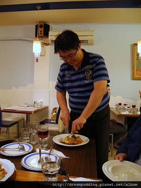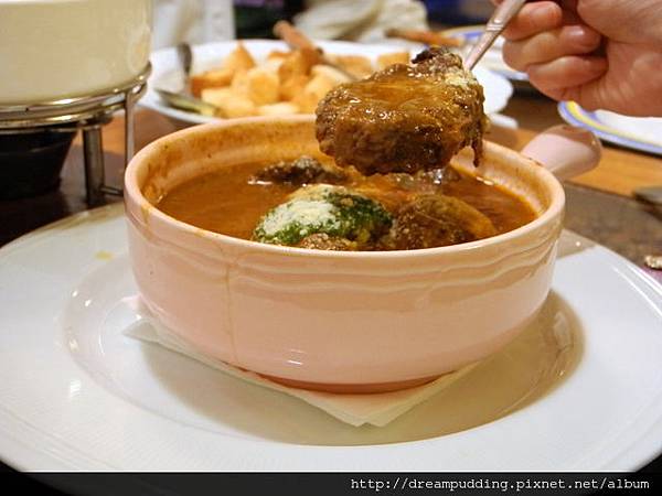 一開始服務人員會為顧客示範怎麼吃起士鍋,麵包叉不可垂直的下鍋,不然麵包丁會滑落。