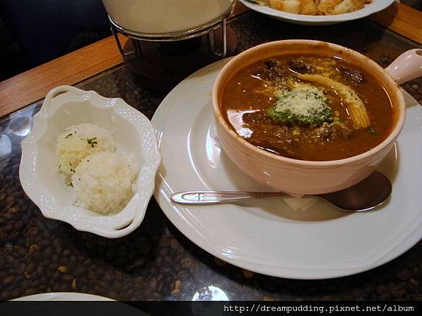 梅洛紅酒燉美國牛腱子肉,這個必點。牛腱子肉燉的十分軟爛,不須費太大力氣咀嚼,而那香濃帶點甘甜的醬汁配白飯很恰恰好,後來拿起士鍋附的麵包來沾也十分好吃,真是很百搭的一款醬汁。