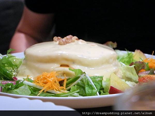 淋上大量起司的鹹口味鬆餅,底部有清爽的沙拉,上面那層濃郁的起司由切達起司、奶油乳酪、藍乳酪跟卡門貝爾起司調製而成,風味很濃郁,鹹甘鹹甘的包覆住柔軟的鬆餅,讓人齒頰留香。