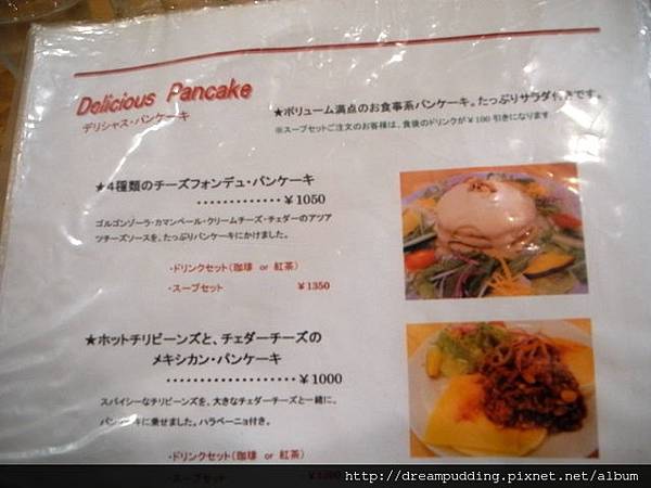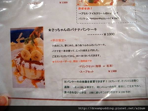 價位都1000多日圓,換算下來跟台灣的鬆餅店價格也是差不多的。有個平日限定的大厚鬆餅那是明森老闆娘推薦必點的,但是因為比較厚,現煎要比較久,所以必須等候30分鐘左右,自由行最多跟最少的就是時間,我們當然是願意等。
