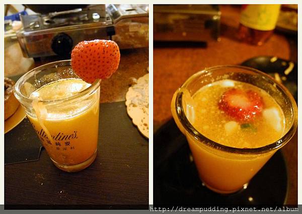 然後這次還有票選最爛禮物得主,如果被票選到,就得喝下這杯特調,這杯特調跟著每道菜上來就從無到有,因為我們把每一道菜的精華都加進去了,女神還好意的加了草莓想讓他看起來好喝點,結果沒想到草莓跳進去湯汁裡了,變成草莓特調。