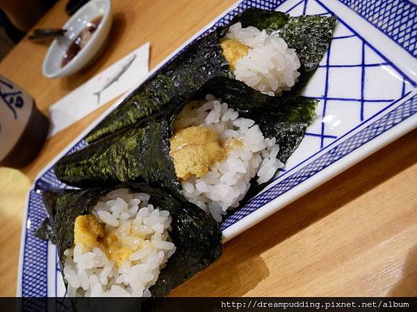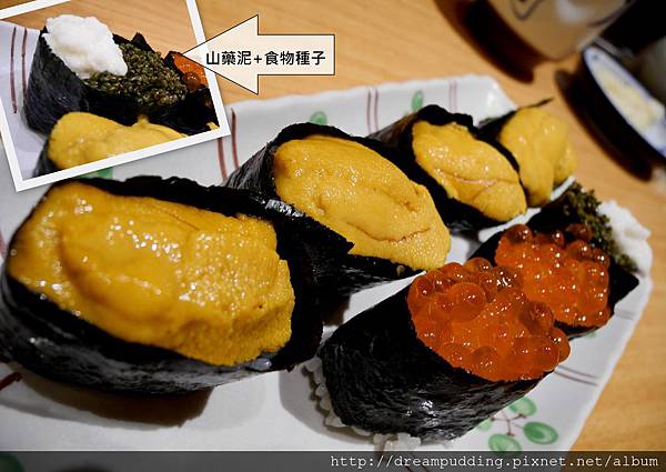 海膽當然是一定要點的阿!一貫才日圓210,換算台幣才63左右,口感新鮮濃郁,當然是要狠狠給他點下去!還有一個山藥泥搭植物種子的,吃起來香滑軟綿也很不錯。